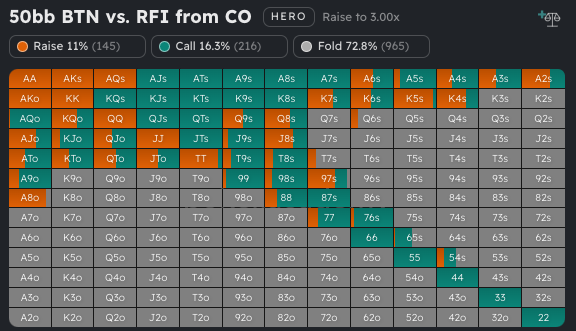With fold-to-3bet% – in general, GTO favours polarized range strategy (3bet best hands, call middle hands, 3bet the weakest hands). It works well against other GTO and semi-GTO players. But you should never use this strategy against players who rarely folds in this situation. Against people with fold-to-3bet lower than 40%, you should always play linear 3bet range (3bet more hands for value and no bluffs/semi-bluffs).